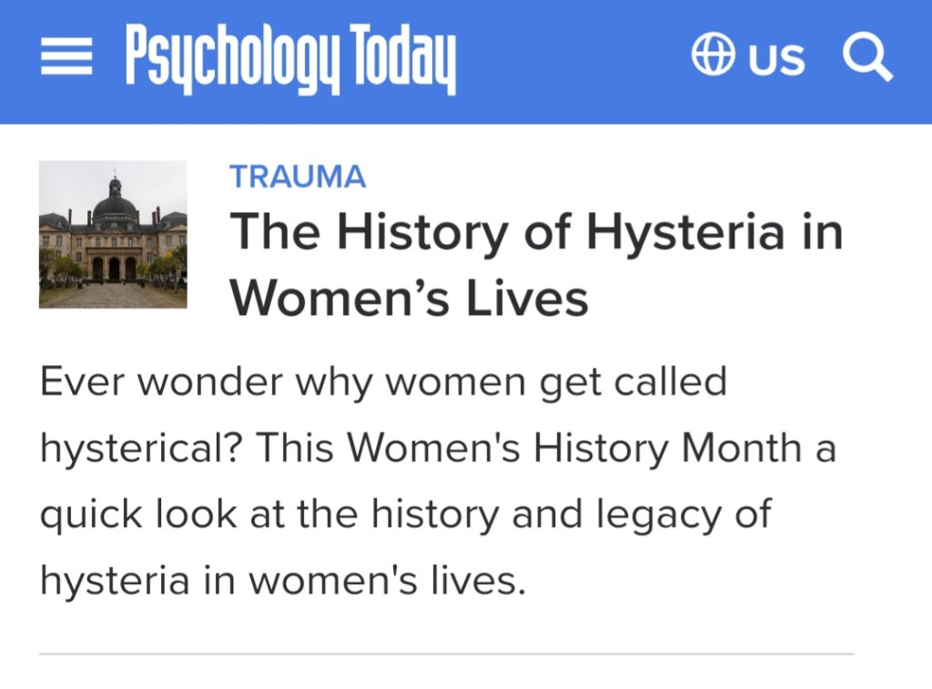 We’ve probably all heard it before: A woman expresses rage or grief and gets called hysterical. Another discloses sexual harassment or assault, and she gets labeled hysterical. The tendency to write off women’s emotions and experiences as hysterical isn’t an accident of history, as I explored in Every 90 Seconds: Our Common Cause Ending Violence against Women. Since it’s Women’s History Month, let’s take a look.