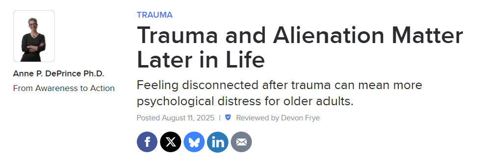 Yet, we haven’t known much about post-traumatic alienation among older adults. Of course, there’s a lot we don’t know about traumatic stress in older adults as there has been relatively less research in this developmental period than others.