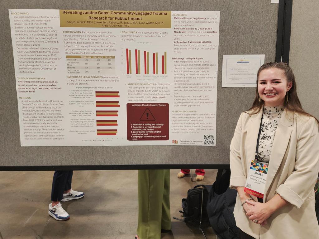Drawing on data from a partnership with the Rocky Mountain Victim Law Center (RMvlc), Amber Fredrick led a poster describing on the legal needs and barriers facing survivors across Colorado as reported by victim service providers annually (2022 to 2024). In 2024, providers also shared the impacts that they were anticipating from impending VOCA funding cuts. As the poster (below) summarized, all three years of data show persistent economic and resource-related barriers to care as well as many unmet legal needs. Further, providers in 2024 anticipated a worsening situation with forthcoming VOCA cuts. The poster featured take-aways for psychologists.