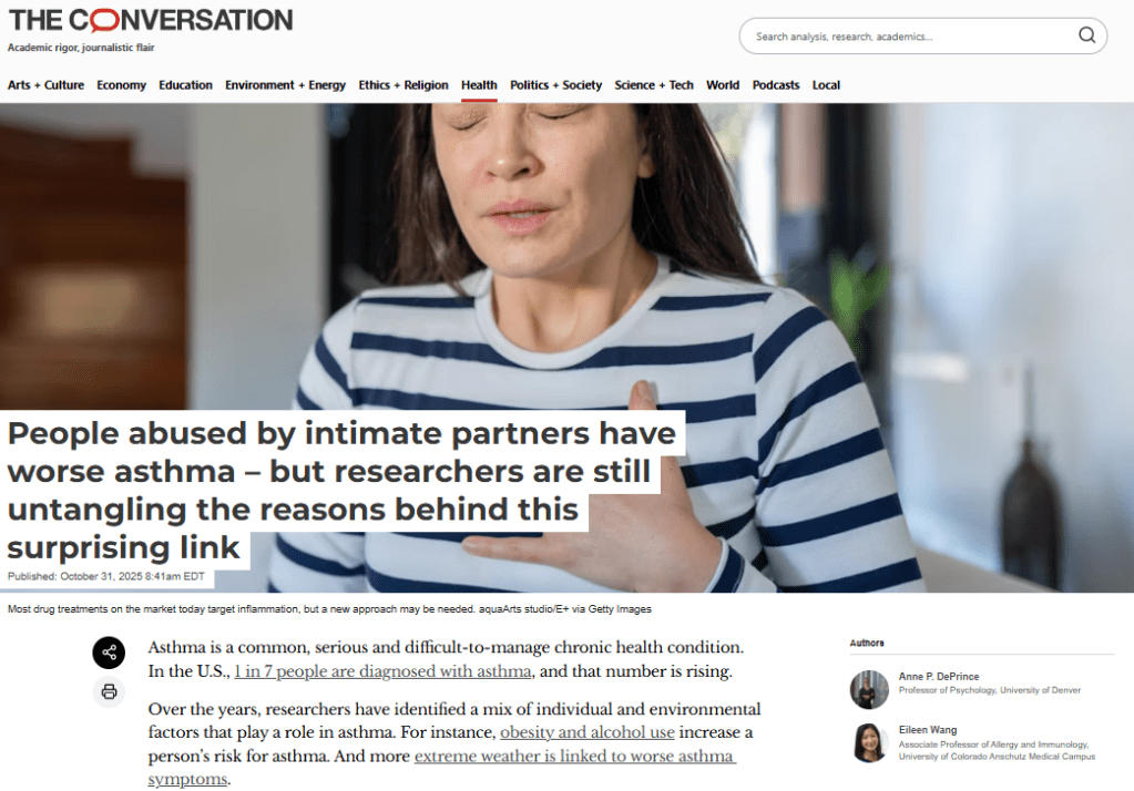 Bringing attention to links between asthma and intimate partner abuse was top of mind when Dr. Eileen Wang and I wrote about new research findings for a piece published today in The Conversation.